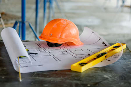 Blueprints project building, construction level and helmet, close up. Construction concept.