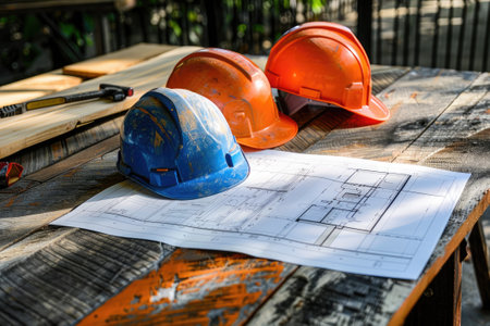 A high-quality image depicting an architectural blueprint on a wooden table, surrounded by essential construction tools and safety gear, capturing the essence of project planning and design.