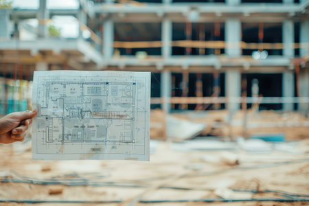 Construction plan in foreground with a multi-story building construction site behind.