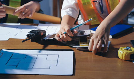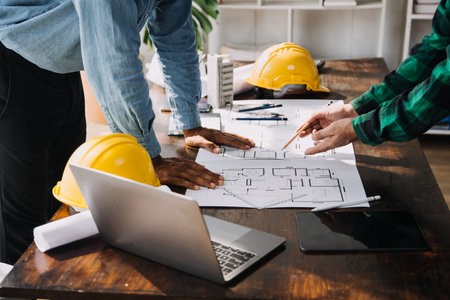 multi ethnic engineer brainstorming and measuring for cost estimating on paperworks and floor plan drawings about design architectural and engineering for houses and buildings.