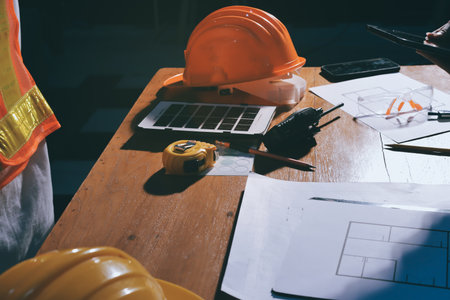 Architecture Engineer Teamwork Meeting, Drawing and working for architectural project and engineering tools on workplace, concept of worksite on technical drawing structure and construction.