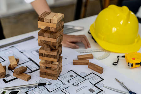 Architect or Construction Engineer working a construction project on drawing table with engineering tool in office. Construction engineering.Selective focus.