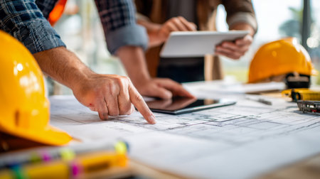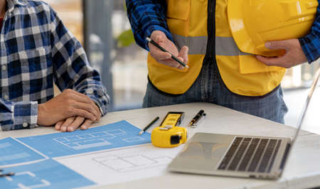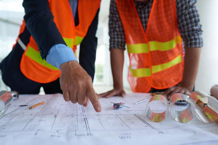 engineer meeting for architectural project, working with partner and engineering tools at workplace. Architect working on blueprint. Construction concept.