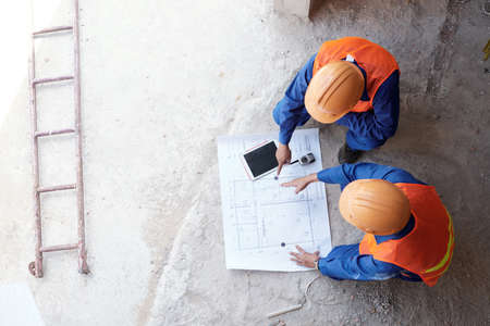 Top view of engineer and architect working on blueprint at construction site.
