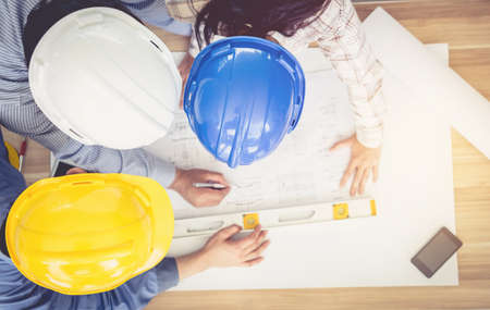 Concept Architects & Teamwork Engineers : Planning meetings, architects and engineers : Top view Fieldwork Three team of architects and engineers working in the construction area.