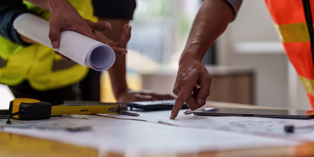 Close-up image of architect discussing blueprint with head engineer