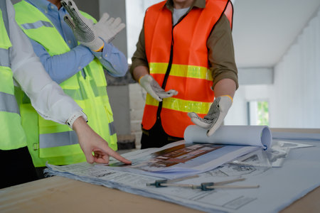 Structural engineer and architect and foreman worker with blueprints discuss, plan working for the outdoors building construction site.
