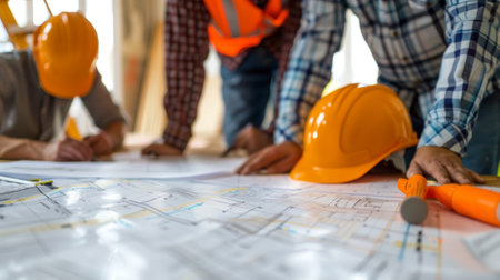A group of professionals analyzes detailed plans around a workspace, wearing safety helmets and using a digital device to coordinate a building project.