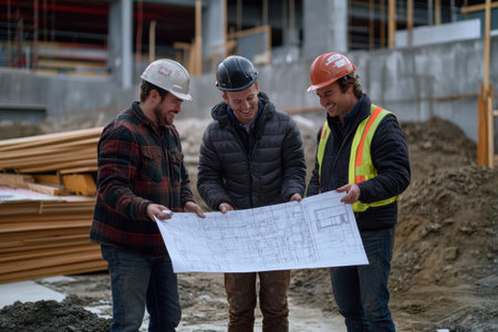 Three Construction Workers Examining Blueprint for Building Project