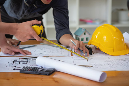 An engineer is using a tape measure to measure the plans of the house that he designs, the drafts the house drawings to build the correct standard. Engineer concept.