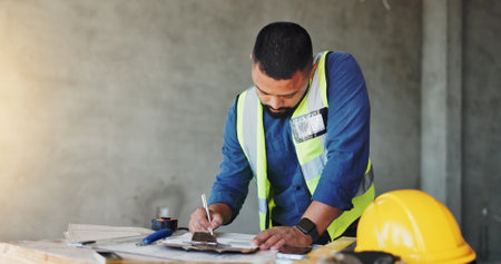 Man, construction worker and writing with clipboard, renovation and notes for safety report at site. Person, engineer and architect with checklist, inspection and space with property development