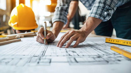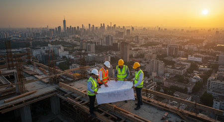 Two builders review printed blueprints on a construction site at sunset, analyzing plans with hands and tools. The scene showcases teamwork and preparation.