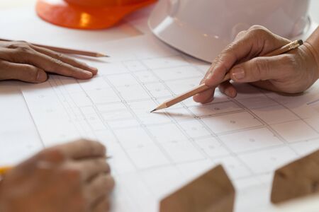 engineer brainstorming and measuring for cost estimating on blueprint and floor plan drawings about design architectural and engineering for houses and buildings.