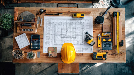 Engineering desk with technical blueprints, measuring tools, and hard hat arranged neatly