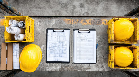 A well-organized construction workspace featuring yellow hard hats, blueprints, and detailed checklists on a sturdy table for efficient project planning and management.