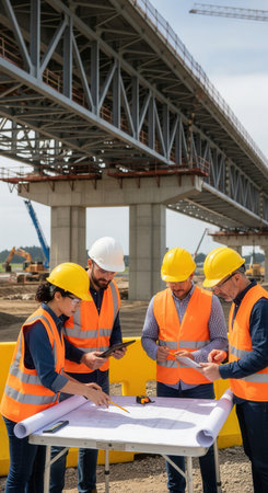 A diverse team of engineers and architects collaborated on blueprints at a bridge construction site. This image conveys professionalism, teamwork, and planning for infrastructure projects.