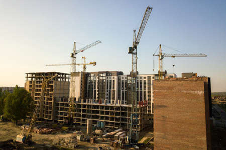 A large construction site of new tall large houses of concrete monolithic-frame buildings with cranes and construction equipment during the repair of new buildings in a large densely populated city.