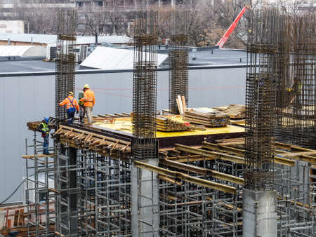 Dnepropetrovsk, Ukraine - 11.30.2021: Workers are assembling metal formwork during the construction of a residential building.