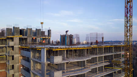 Formwork and building metal supports are used in the modern construction of load bearing structures of residential buildings against the blue sky.