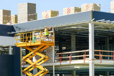 Construction works on metal walls of commercial building. Blue collar workers at large site with scattered equipment. Development of residential housing in America. Real estate market in USA
