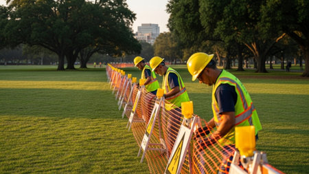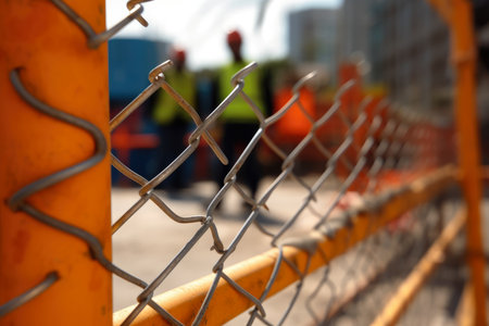 Temporary fencing with steel mesh surrounding a busy construction zone, safeguarding workers and equipment