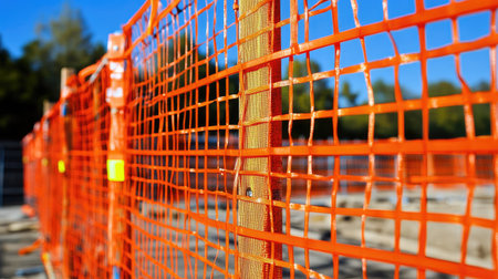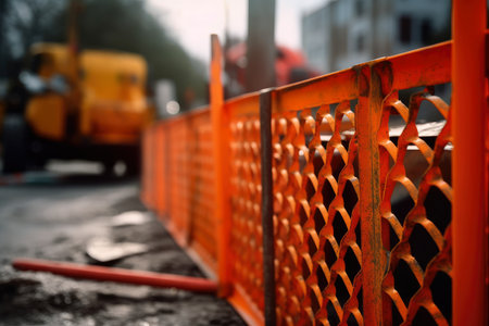 Vibrant Macro Capture: Contrasting Industrial Machinery and Bright Orange Safety Barrier on Construction Site