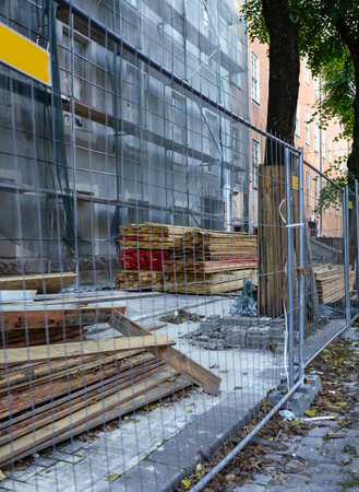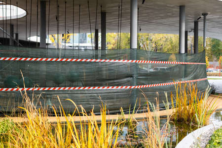 The building is fenced with a fence and a construction protective net, repair of the facade of the building. Construction and repair of buildings, restoration. Scaffolding, roof repair boards, construction work in progress