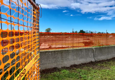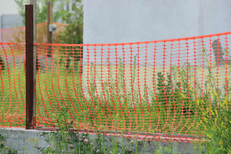 Restriction plastic mesh fence at industrial construction site. Protective barrier for pedestrians safety