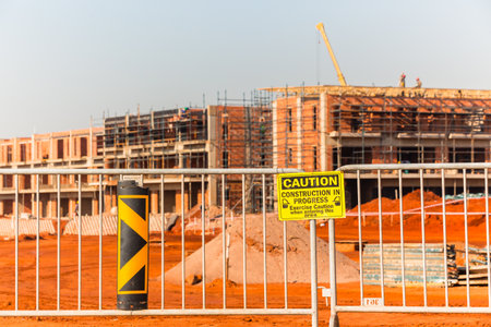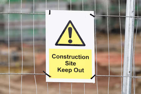 Construction apartments site of new building in progress with caution sign on boundary fence.