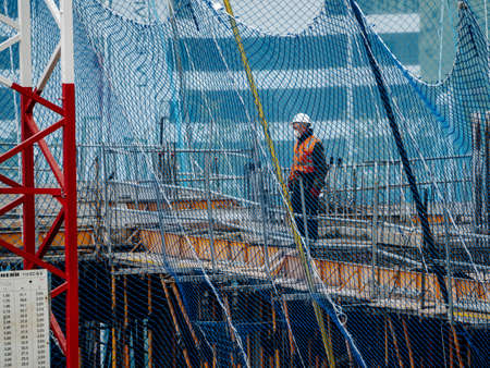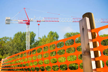 Tower crane in a construction site with metal scaffolding to work on the building facade and perforated safety orange plastic grid to delimit and protect construction site areas.