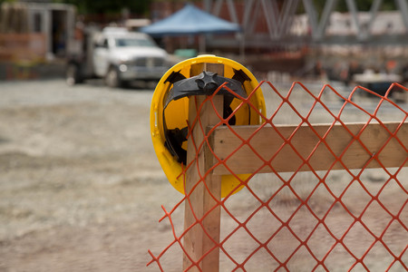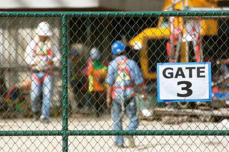 Close-up of a safety barrier at a construction site with a worker in a hard hat visible in the background