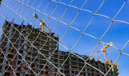 Confined space with orange, plastic, safety mesh is placed around the new unfinished multi-storey building, residential complex under construction.