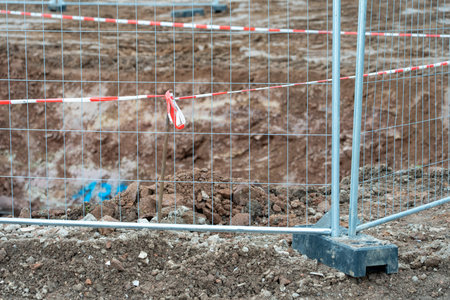 Close-up of a galvanized steel perimeter fence protecting an excavation pit.