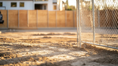 This image captures a construction site with a chain-link fence and flat ground, set against a warm sunset, highlighting the potential for new developments in an urban environment.
