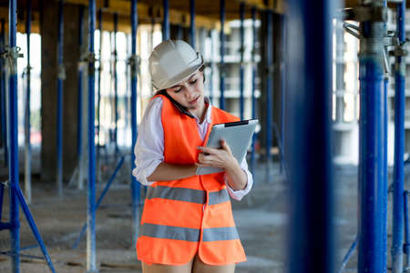 Portrait Women engineer worker foreman builder work in construction site with safety helmet.