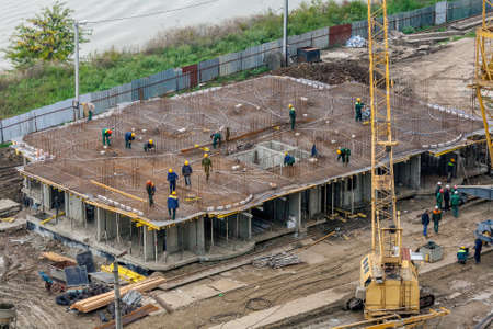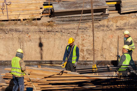 Dnepropetrovsk, Ukraine - 02.10.2022: A worker prepares formwork for a modern metal-concrete structure of a residential building.