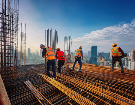 Skilled workers reinforce a high-rise site at sunset over the city.