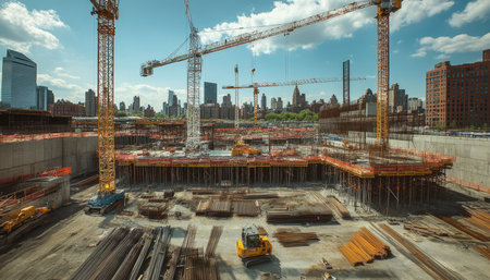 A bustling construction site featuring heavy machinery and workers engaged in various tasks amidst a dynamic urban skyline, reflecting development and progress.