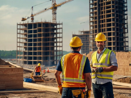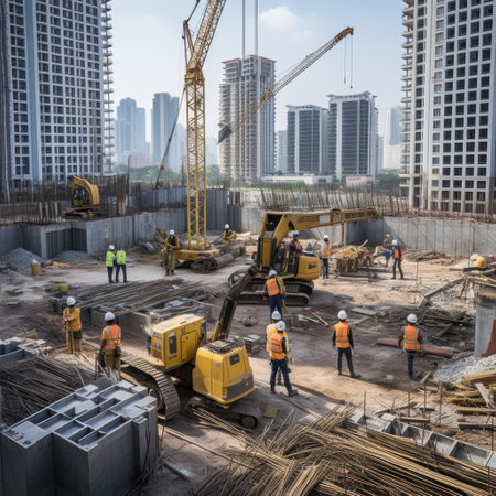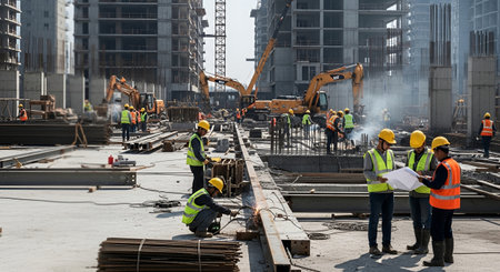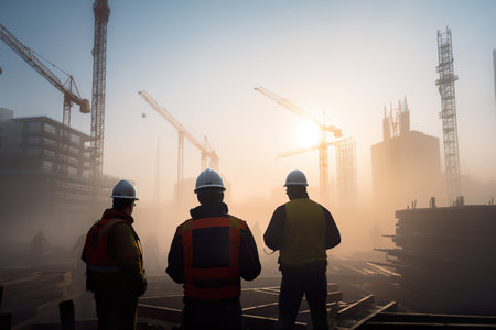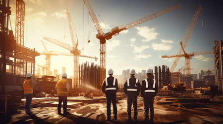 As the sun sets behind towering cranes, construction personnel in high-visibility vests stride through a bustling urban site, surrounded by unfinished concrete frame
