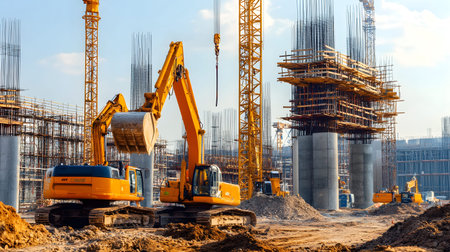 Construction site with crane, excavator, and scaffolding. design for building and development projects.