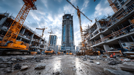 High quality high dynamic range construction site with cranes and skyscrapers in urban area