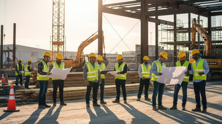 Construction workers reviewing blueprint on site professional project management discussion