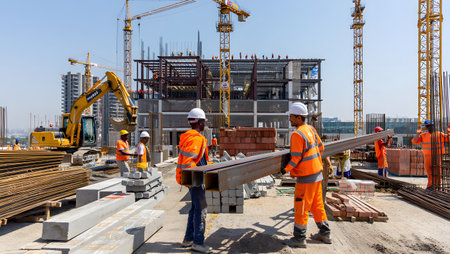 Workers in orange vests carry steel beams at a busy construction site with cranes. Clear details ...