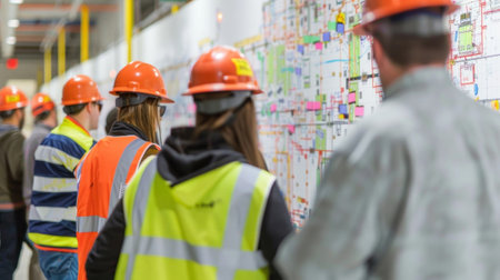 Construction crew meeting at site featuring multiracial team in safety gear with machinery.