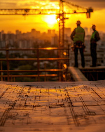 Team of craftsmen examining detailed plans against a glowing sunset sky atop a towering urban construction zone, capturing focus and teamwork.
