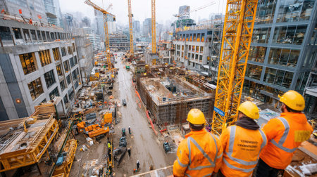 A dynamic construction site panorama featuring workers in safety helmets observing ongoing building activities, showcasing cranes and heavy machinery in an urban environment.