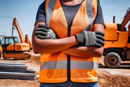 Construction worker wearing safety vest and gloves on site