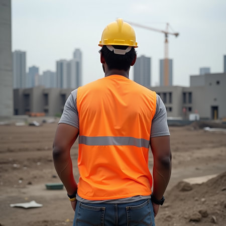 A construction worker wearing a hard hat and safety vest stands at a building site, overseeing the progress of structures and equipment, ensuring safety and efficiency.
