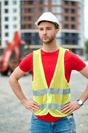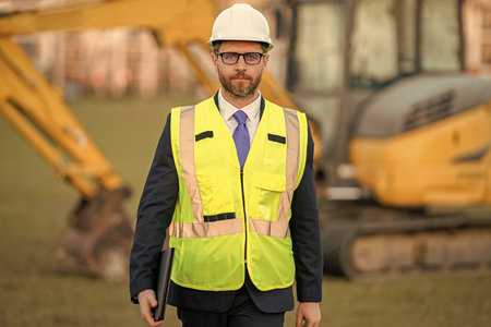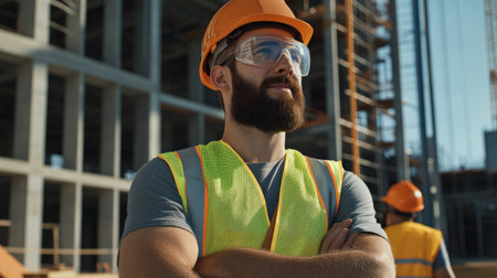 Experienced construction worker wearing high visibility vest and safety helmet overseeing site supervision during daytime outdoor work on a real estate development project