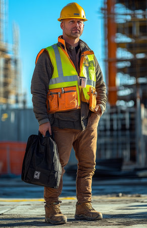 Bald construction worker in yellow hard hat, reflective vest, and jacket holding black bag onsite